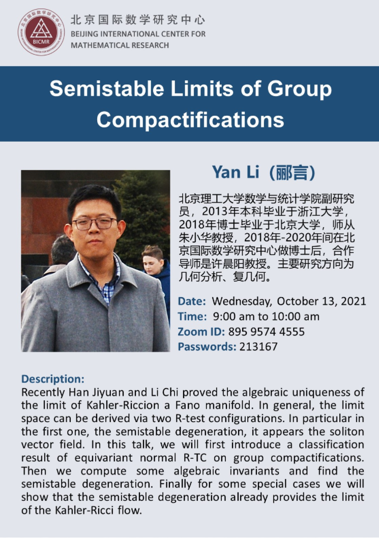 Abstract: Recently Han Jiyuan and Li Chi proved the algebraic uniqueness of the limit of Kahler-Riccion a Fano manifold. In general, the limit space can be derived via two R-test configurations. In particular in the first one, the semistable degeneration, it appears the soliton vector field. In this talk, we will first introduce a classification result of equivariant normal R-TC on group compactifications. Then we compute some algebraic invariants and find the semistable degeneration. Finally for some special cases we will show that the semistable degeneration already provides the limit of the Kahler-Ricci flow.
