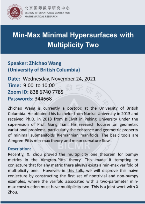 Zhichao Wang is currently a postdoc at the University of British Columbia. He obtained his bachelor from Nankai University in 2013 and received Ph.D. in 2018 from BICMR in Peking University under the supervision of Prof. Gang Tian. His research focuses on geometric variational problems, particularly the existence and geometric property of minimal submanifolds Riemannian manifolds. The basic tools are Almgren-Pitts min-max theory and mean curvature flow.