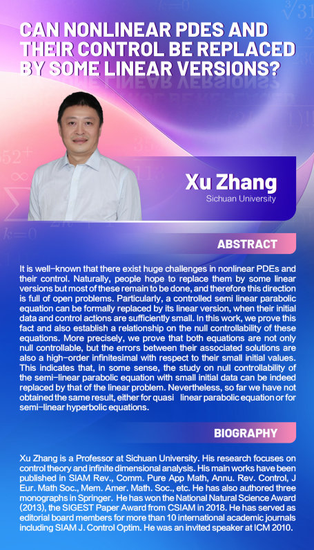 In this workshop, we study some recent developments of mathematical control theory for PDEs and SDEs. The main goal of this workshop is to bring together several specialists in control theory from various perspectives.